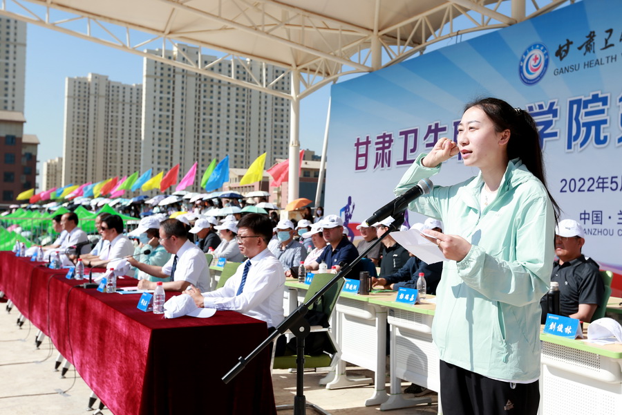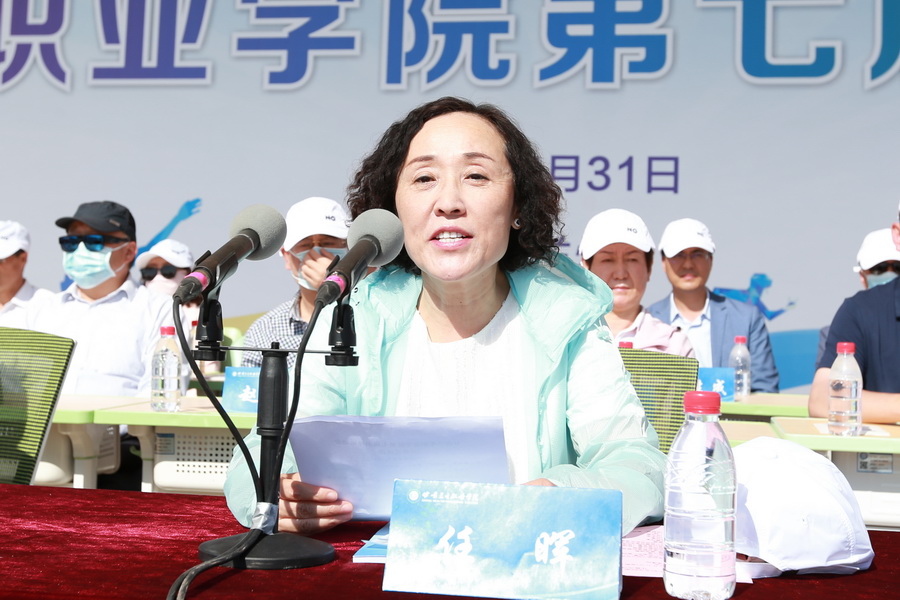 校长任晖致开幕辞。她代表学校领导班子向运动会的胜利召开表示热烈的祝贺,向刻苦训练、积极参赛的运动员致以亲切的问候,向参与筹备组织工作的师生表示衷心的感谢。任晖校长既阐述了本次运动会的意义,并提出了希望:希望全体运动员能以高昂的斗志和顽强的精神积极参赛,为集体增光,在赛场上尽情体验竞赛的魅力,全面诠释体育精神,努力拼搏,超越自我,充分展现昂扬向上的青春活力、奋发进取的精神风貌和全面发展的优良素质;希望全体裁判员、工作人员忠于职守,树立安全第一意识、热情服务意识、严守规则意识,做到公正裁判、热情服务,为各项竞赛创造良好氛围,保障竞赛顺利进行;希望没有比赛项目的师生服从大会管理,文明参观,主动服务,为运动员摇旗呐喊、加油助威;希望全体师生传承学校发展的良好势头,认真工作学习,不负韶华,蓄足力量,奋力拼搏;希望全体卫职院人不忘初心,同舟共济,砥砺前行,在“双高”院校建设的道路上迈出更加坚定的步履,跑出卫职院发展的加速度。最后,她热情号召全体师生齐心协力,把本届运动会办成一个“文明、热烈、精彩、圆满”的盛会。
