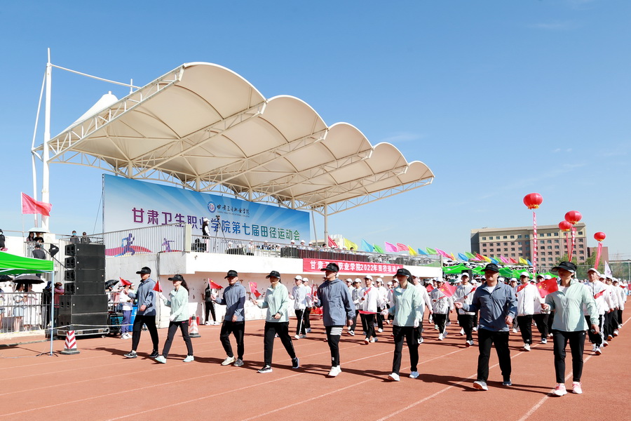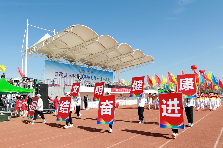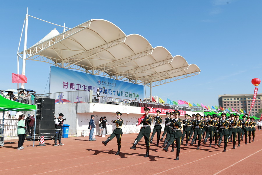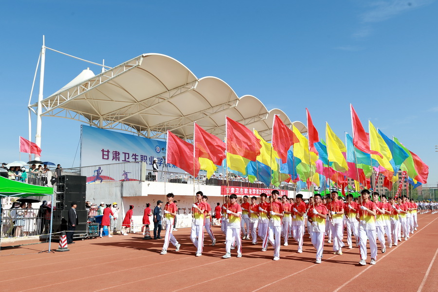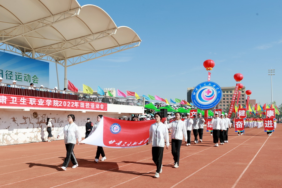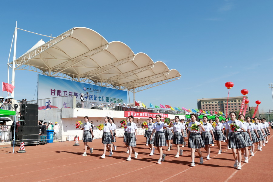 随着激昂的运动员进行曲响起,国旗、校旗、校徽、口号(文明、健康、团结、奋进)、彩旗队、花束队、裁判员代表队、各专业运动员代表队方阵依次入场。各方阵队伍步伐整齐、口号嘹亮,青春洋溢的笑脸、迎风飞舞的彩旗、鲜艳夺目的花束无不展现出甘卫院人的青春活力与意气风发。