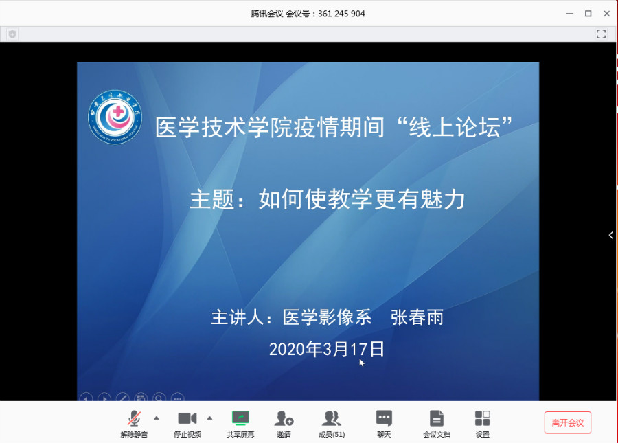 启动仪式结束后,张春雨作了主题为《如何使教学更有魅力》的“线上论坛”第二次讲座。张春雨首先从自己的教学实践出发,解释了什么是教学魅力,然后分析了教学魅力的五个作用:一是示范作用,二是熏陶作用,三是激励作用,四是迁移作用,五是实现价值。接着以形象生动的语言与事例分别展示了形象魅力、语言魅力、思想魅力、人格魅力、学识魅力及专业魅力这六种教学魅力的具体应用和在教学中发挥的积极作用。张春雨的讲座贴近教学实际,贴近日常生活,幽默而不失书卷气,大家都获益良多,取得了圆满成功。