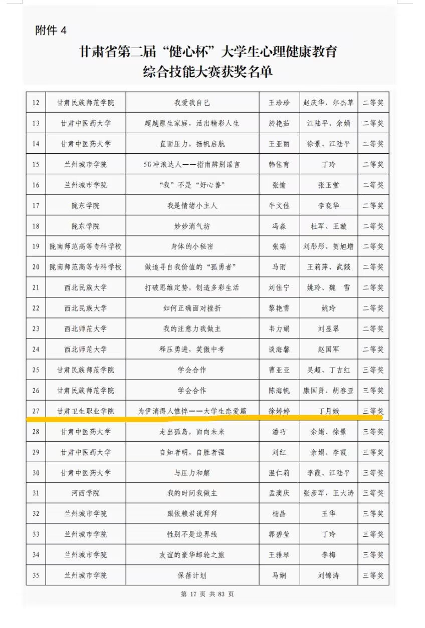 2022年10月15日,由甘肃省教育厅主办、西北师范大学心理学院和甘肃省心理学会联合承办的甘肃省大学生“健心杯”心理健康教育综合技能大赛落下帷幕,比赛结果拟推荐获奖名单于11月下旬公示10日,现已审核通过并公布,天游官网由心理健康教育中心主任丁月娥老师指导的徐婷婷同学在本次活动中取得了省级三等奖的优秀成绩。