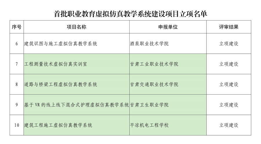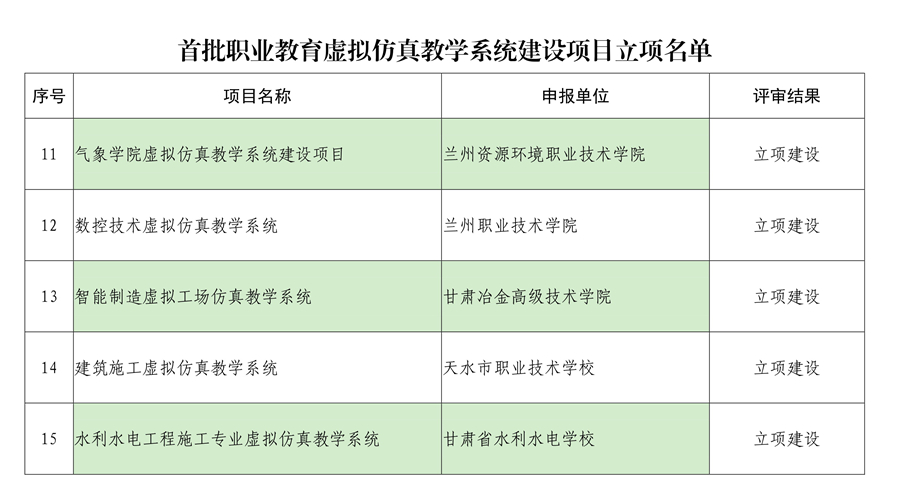 根据《国务院关于印发<国家职业教育改革实施方案>的通知》(国发[2019]4号)和《甘肃省教育厅等六部门关于印发<现代职业教育体系建设规划(2014-2020年)>的通知》(甘教厅[2014]74号)精神,今年7月省教育厅决定开展首批职业教育虚拟仿真教学系统建设项目的认定工作,面向资源环境、土木水利、交通运输、智能制造、物流、新能源等领域,认定15个职业教育虚拟仿真教学系统建设项目,省优质高等职业院校推荐3个,其它高职高专院校推荐1个。