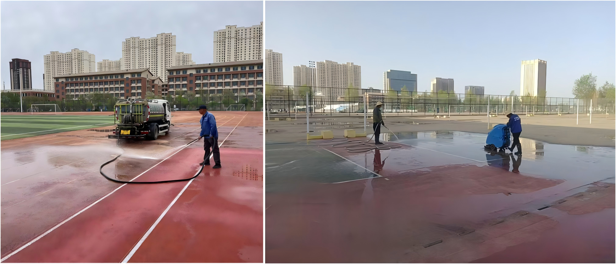 操场主席台塌陷维修工期紧、任务重,维修队迅速行动、加班加点,经过多日奋战,目前主席台修复工程已顺利完工。同时,为保证运动会期间校园环境整洁美观,保洁队出动高压冲洗车对操场跑道进行深度清洗,并增设十余个临时垃圾回收点。绿化队也积极行动,对校园仁湖实施景观提升,岸边进行了全面修整,清理杂草、加固护坡,并在仁湖投放二十余只雏鸭,为校园增添了生机与活力。