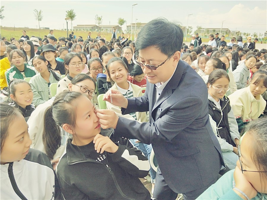 9月24日下午,中医药学院校企合作单位兰州新区科文旅集团医养公司体康心悦药业协同远大药业联合浙江贝立凯科技有限公司走进新区职教园区天游官网,发起“关爱下一代,爱眼护眼”爱心行动在6号教学楼前广场举行。活动由中医药学院副院长田卫东主持,中医药学院院长李钦,党总支副书记王彪,体康心悦董事长朱永红,总经理刘坚,远大医药总经理王彩丽、区域经理王青,贝立凯公司区域经理宋如青、何明香以及全校教职员工及学生代表参加了此次公益活动。