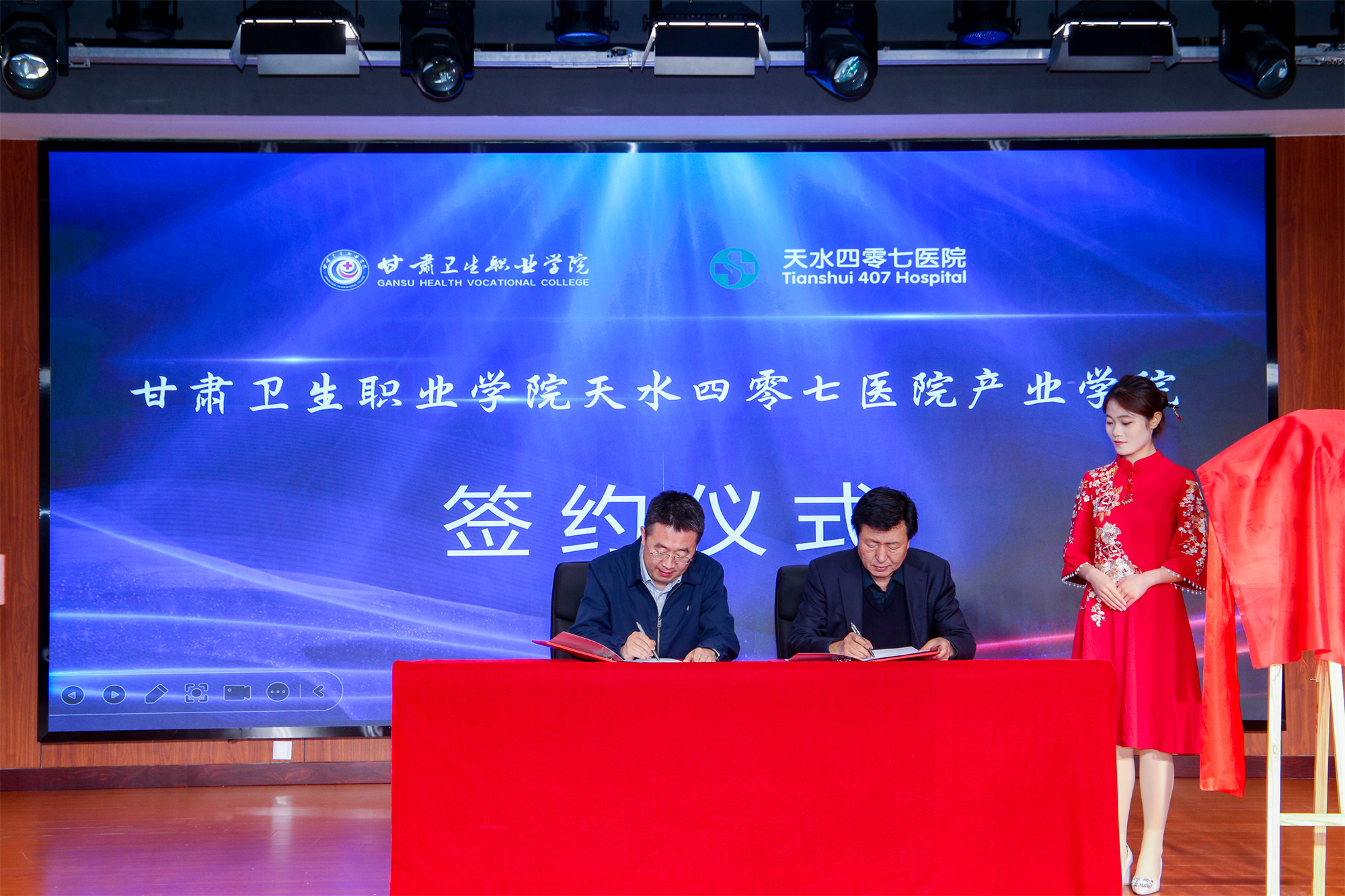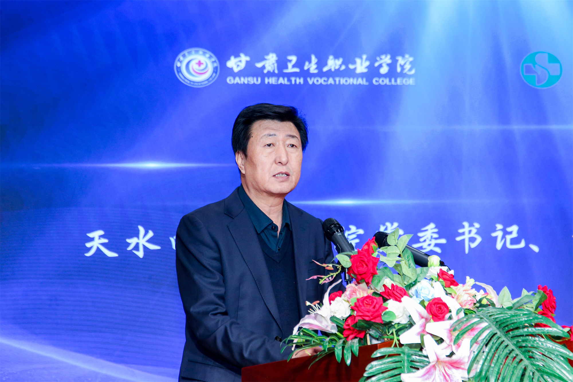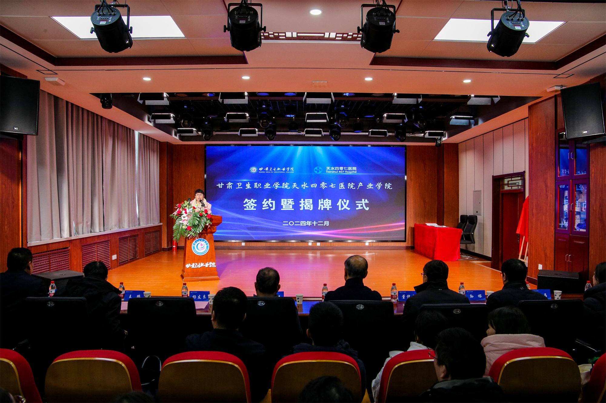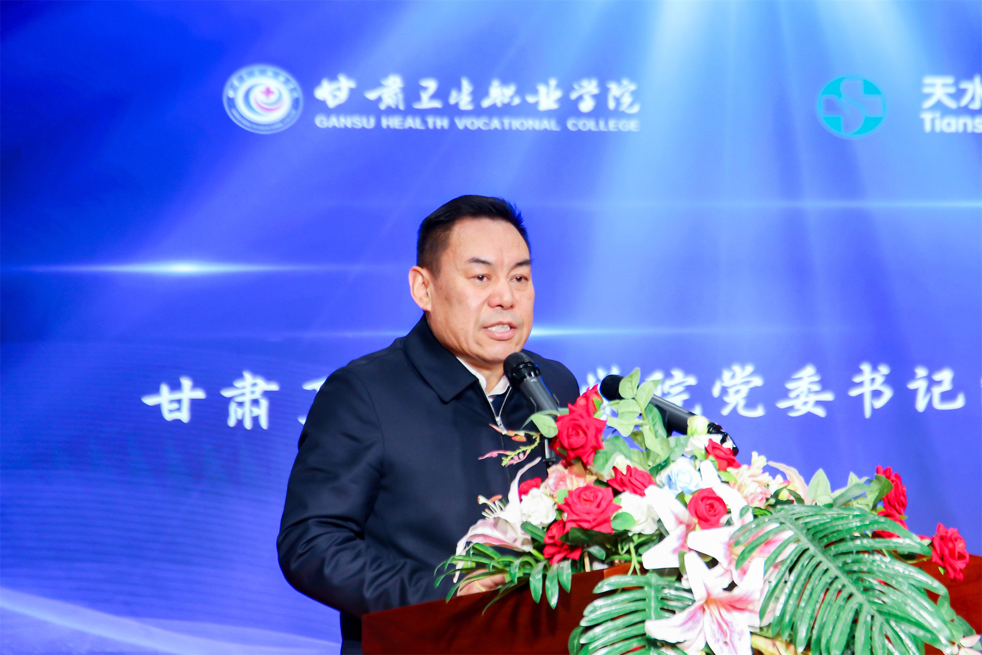 包磊致欢迎辞。他首先代表学校向出席活动的领导和嘉宾表示欢迎。他表示,学校与天水四零七医院的合作,可谓是“珠联璧合、强强联手”,不仅是院校合作的典范,更是产教融合的生动实践,为培养适应新时代需求的医疗卫生专业人才开辟了新的道路。天水四零七医院产业学院的设立,是时代赋予学校的历史使命,是深化产教融合、全面提升人才培养质量的创新之举。学校将以产业学院为新起点,与天水四零七医院共同开创医药健康职业教育与医疗服务的新篇章,为健康中国、健康甘肃贡献力量。