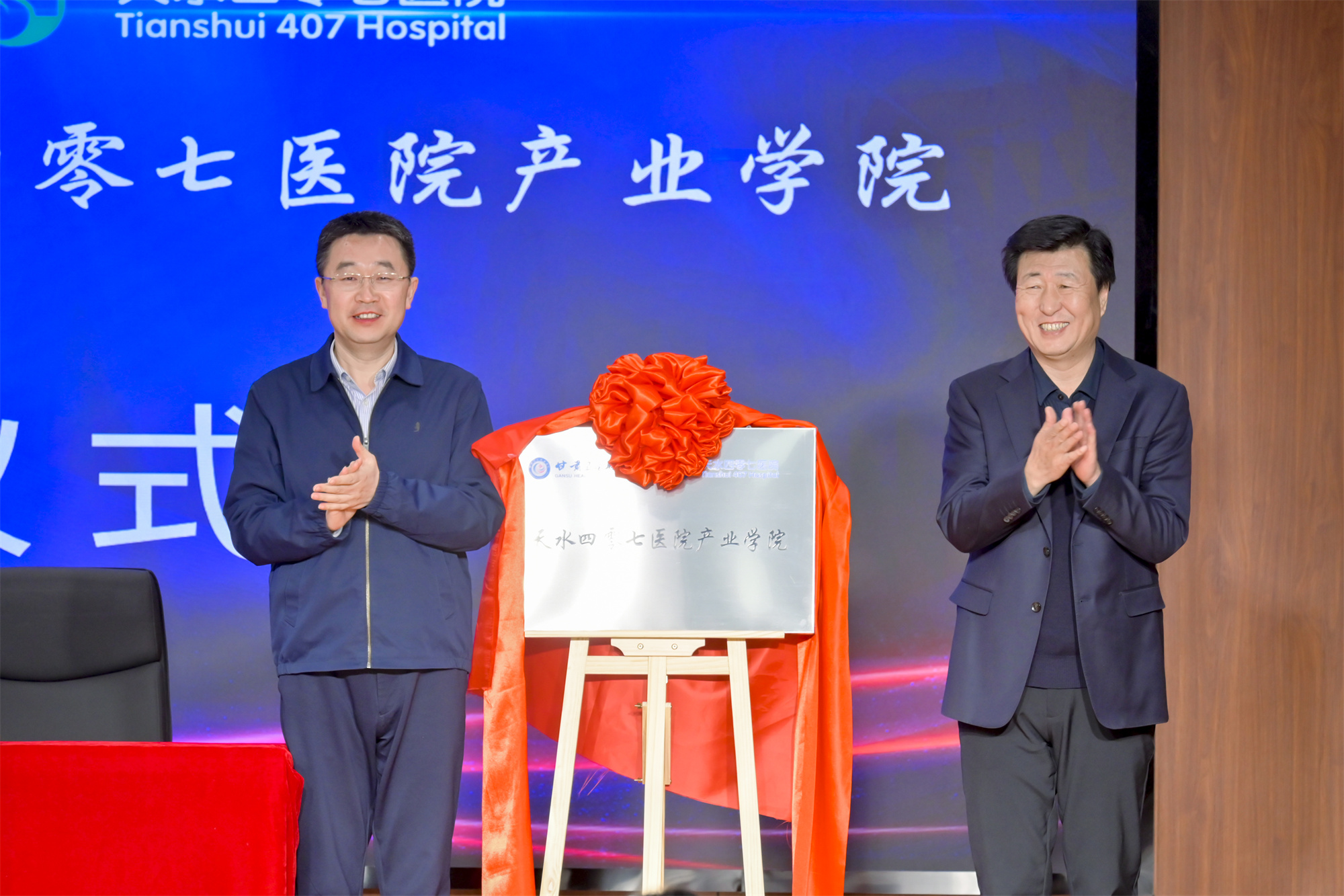 甘肃省医药健康产业发展协会李存文会长、天游8线路检测中心包磊书记、王建成校长和天水四零七医院杨友良董事长共同为“天游8线路检测中心天水四零七医院产业学院”揭牌。