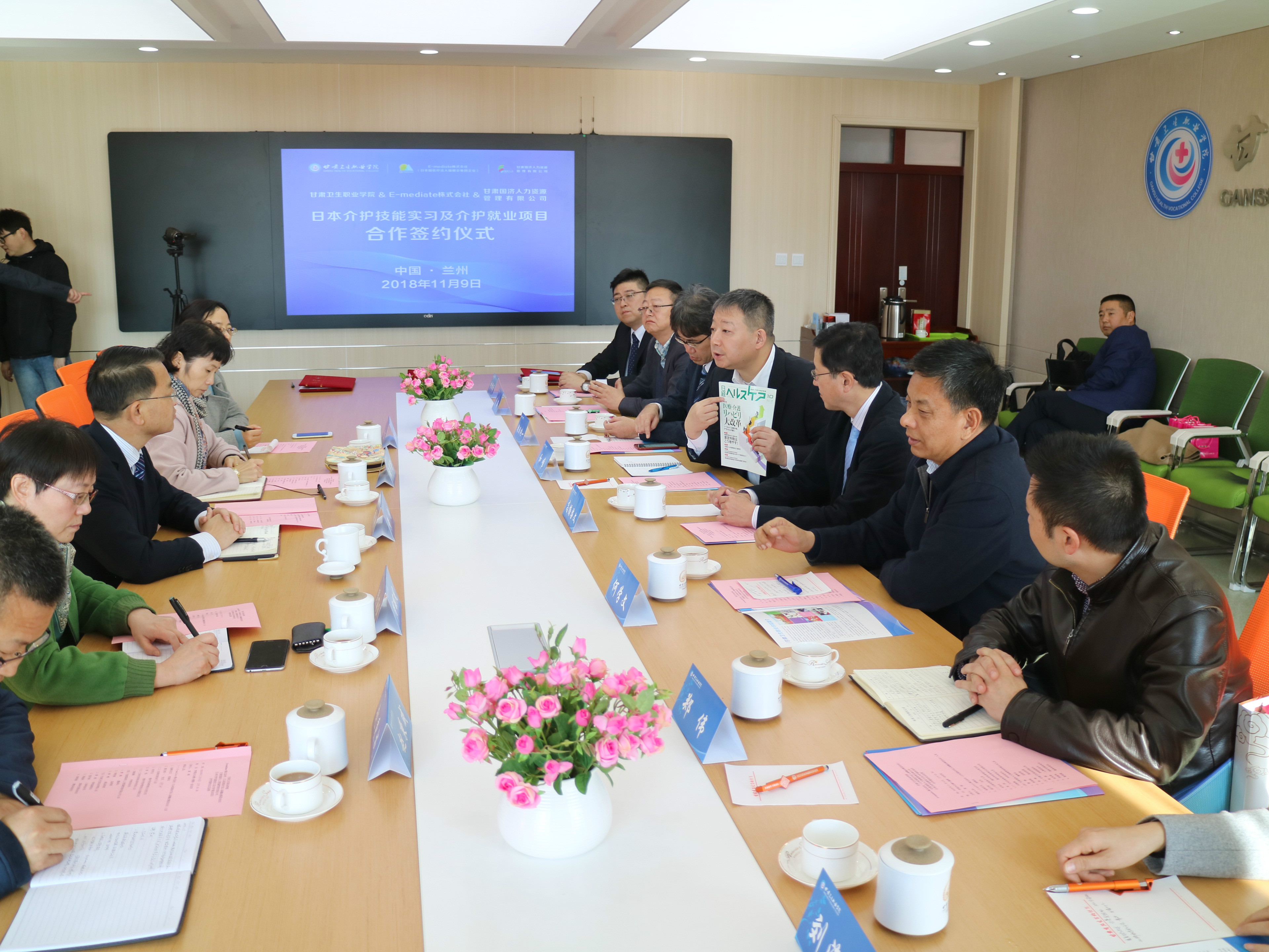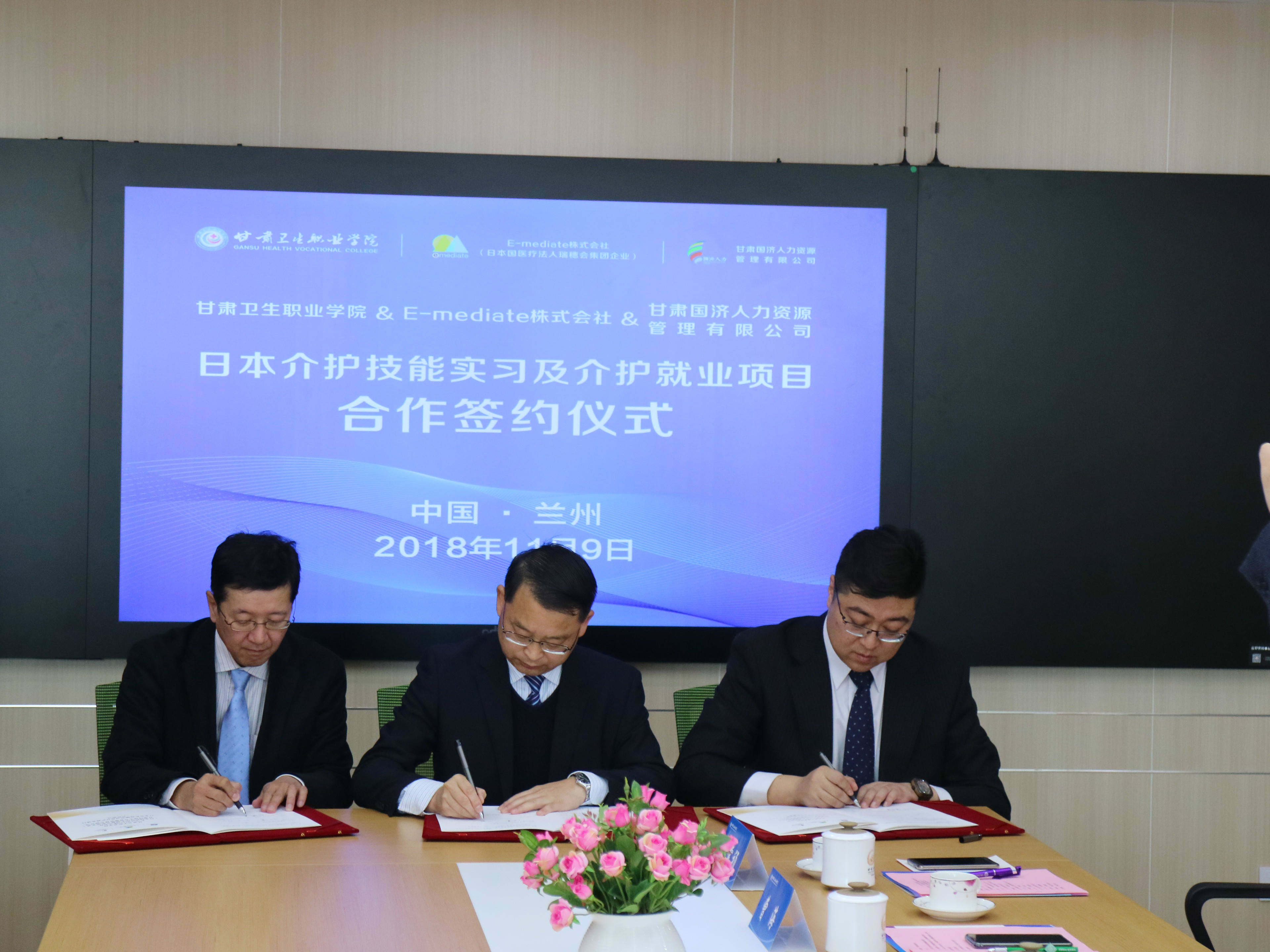 11月9日上午,日本E-mediate株式会社、医疗法人瑞穗会集团代表高桥启文理事长、朝日纯一先生一行两人,在省商务厅境外劳务管理办公室何学文主任及郑伟副主任、兰州市商务局外经处刘海燕处长、甘肃国济人力资源管理有限公司曹海董事长、李常祯总经理及和唯副总经理的陪同下,到天游官网就学校、日本公司和中方企业三方合作开展日本介护技能实习及介护就业项目进行签约。签约仪式由黄刚副校长主持,相关处室负责人参加了签约仪式。