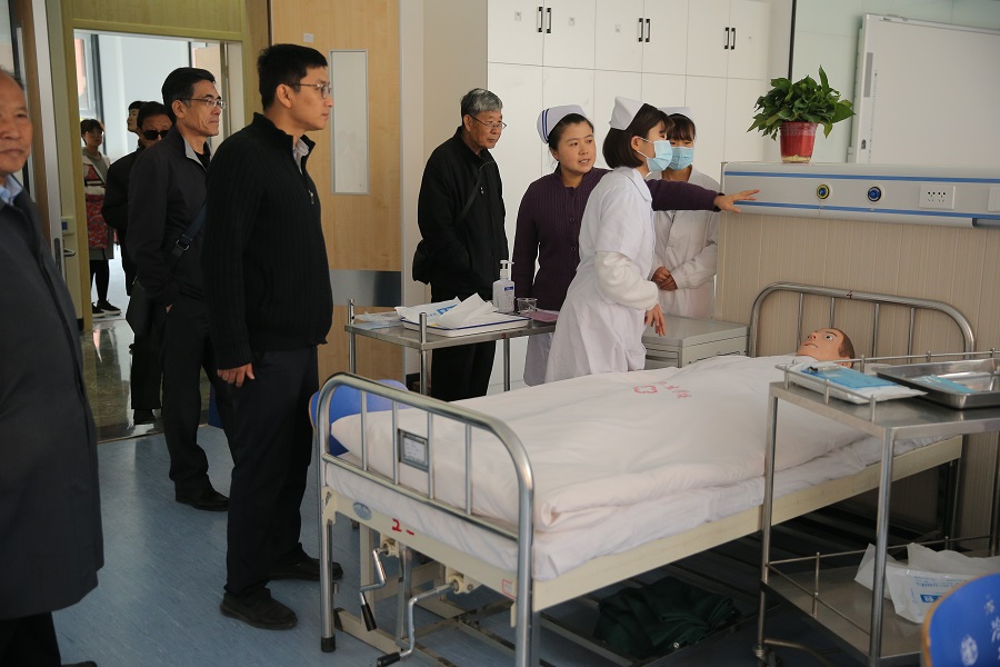 考察组一行在校领导的陪同下先后对护理实训中心、中医针推实训中心、学生食堂等区域进行了实地考察。