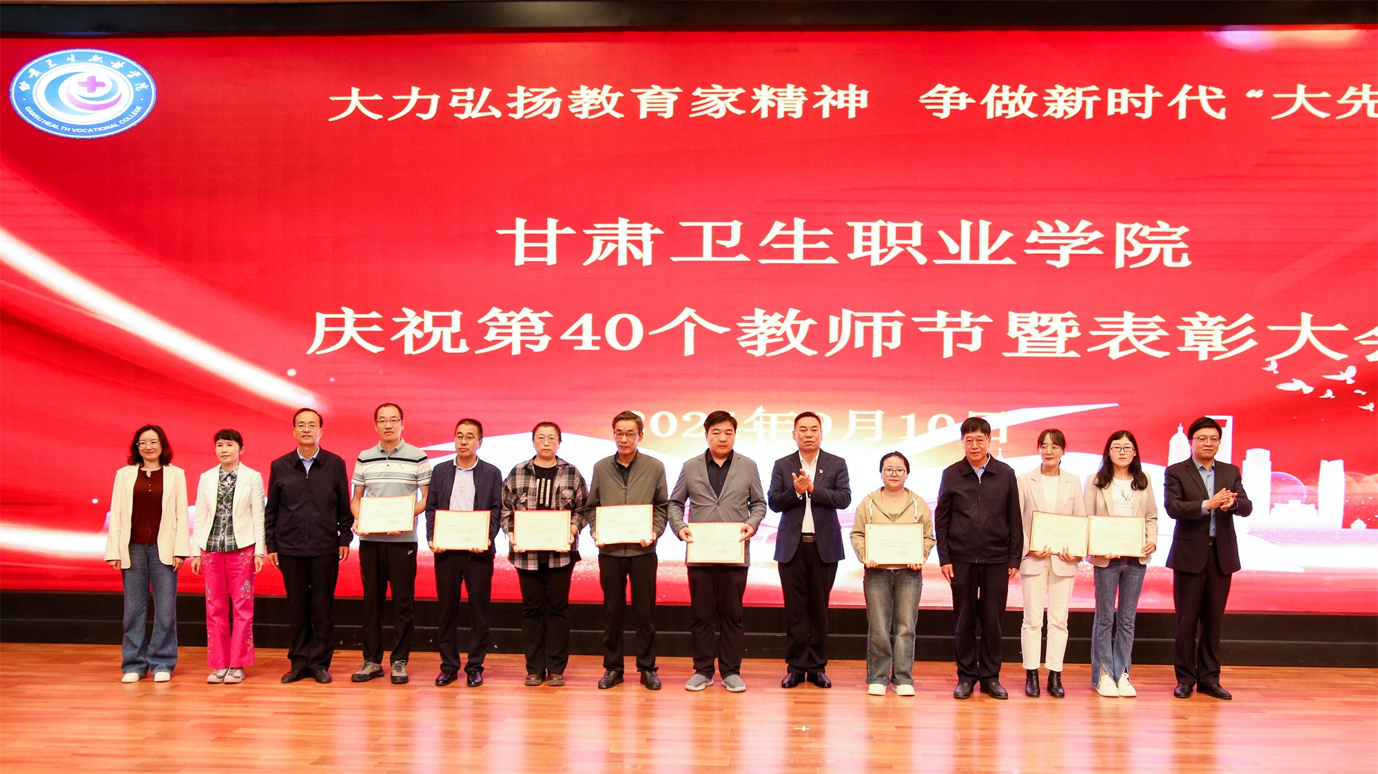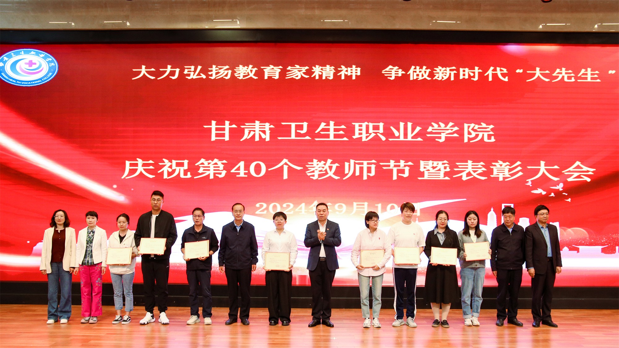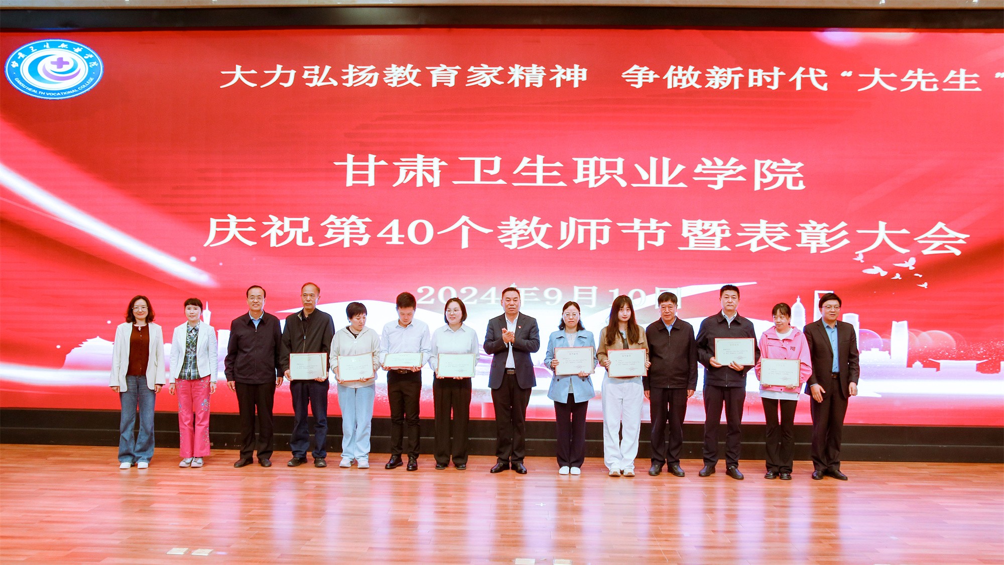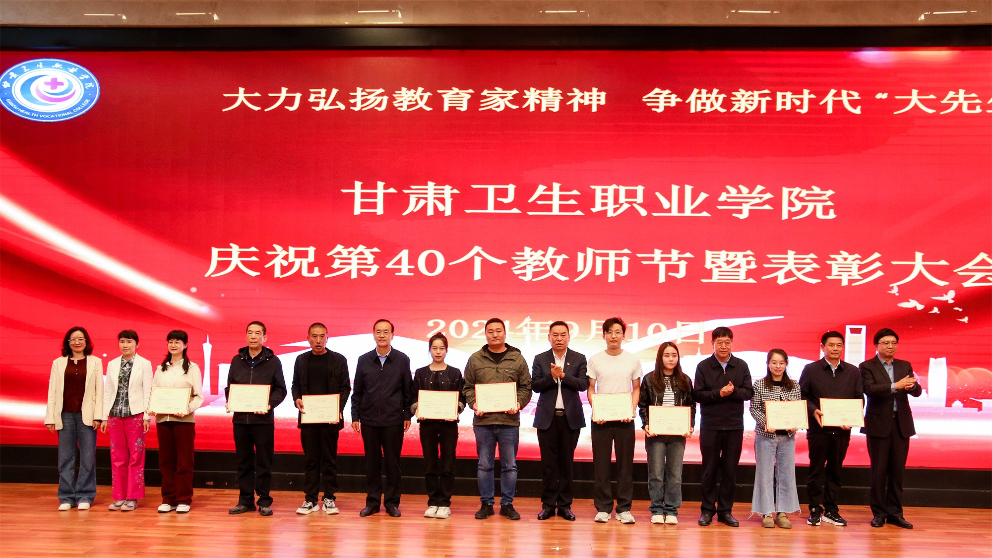 最后,党委书记包磊代表学校党委向默默耕耘、无私奉献的广大教职员工致以节日的问候和崇高的敬意,向受到表彰的先进集体和个人表示热烈祝贺。他赞扬了新入职教师的激情和决心,肯定了在职教师的奉献和成就,以及退休教师的贡献和精神。包磊指出,卫职院因医而名、因医而荣、因师而兴。学校发展正面临着新形势、新阶段、新目标、新要求,面对新的发展机遇,学校正以“锐意改革、矢志跨越”的责任使命和敢于担当的勇气,坚持把教师作为学校发展第一资源,努力形成广大教师尽展其才、高素质专业化创新型教师队伍不断涌现的良好局面。他提出了几点希望与老师们共勉:一是胸怀红色印记,做永远跟党走的教师;二是涵养高尚师德,铺就最美职业底色;三是大兴笃学之风,锤炼高超娴熟师艺;四是紧扣时代脉搏,不断提高新质素养。最后,他表示学校今后将始终坚守教师为立校之本、兴校之源这一本质,大力弘扬尊师重教风尚,用心用情用力做好教师管理服务和培训培养工作,让广大教师安心从教、热心从教、舒心从教。