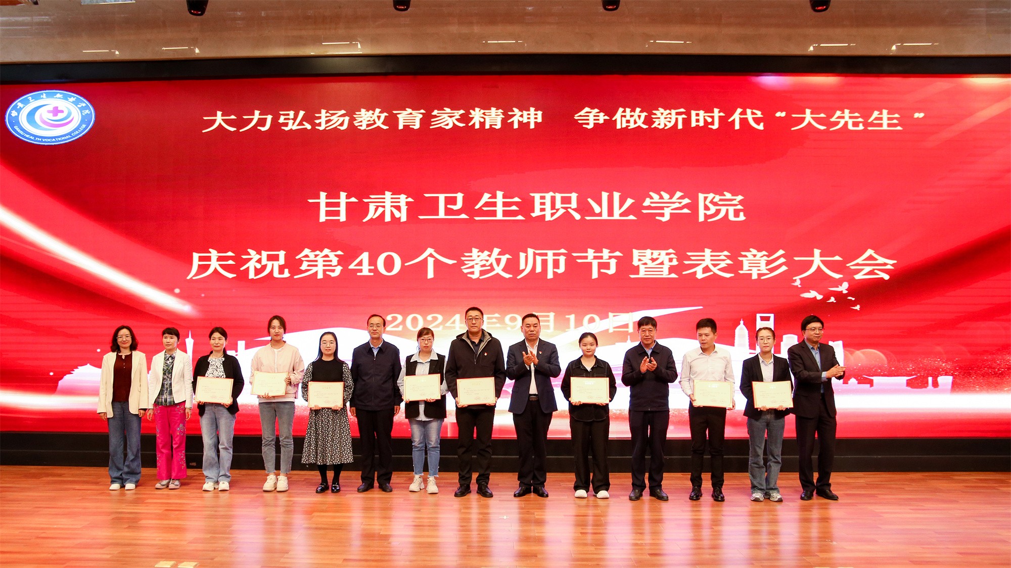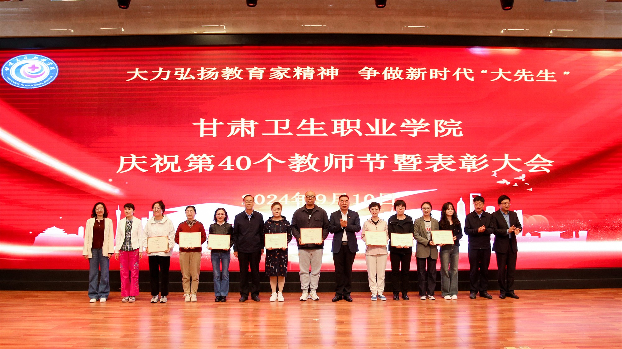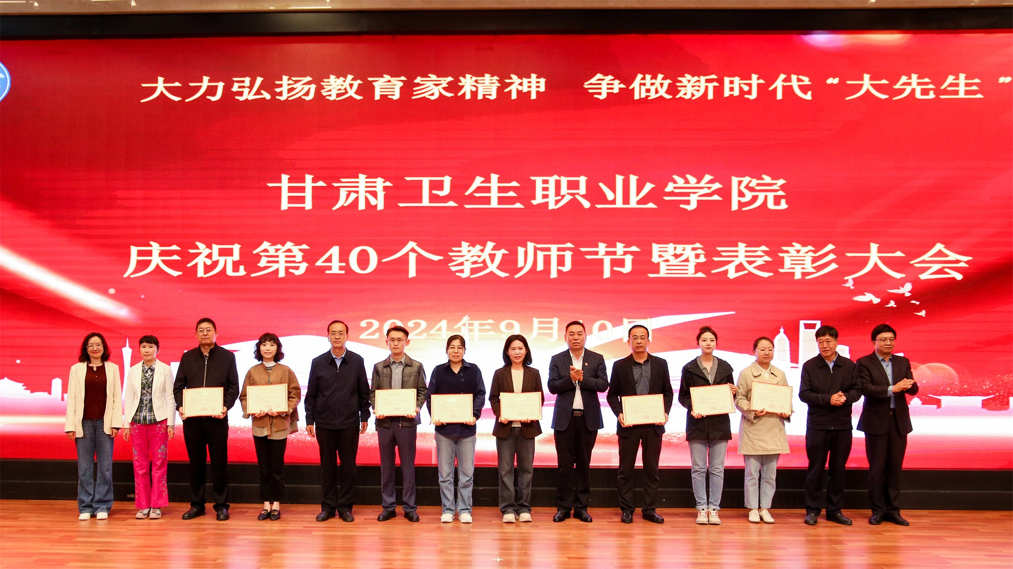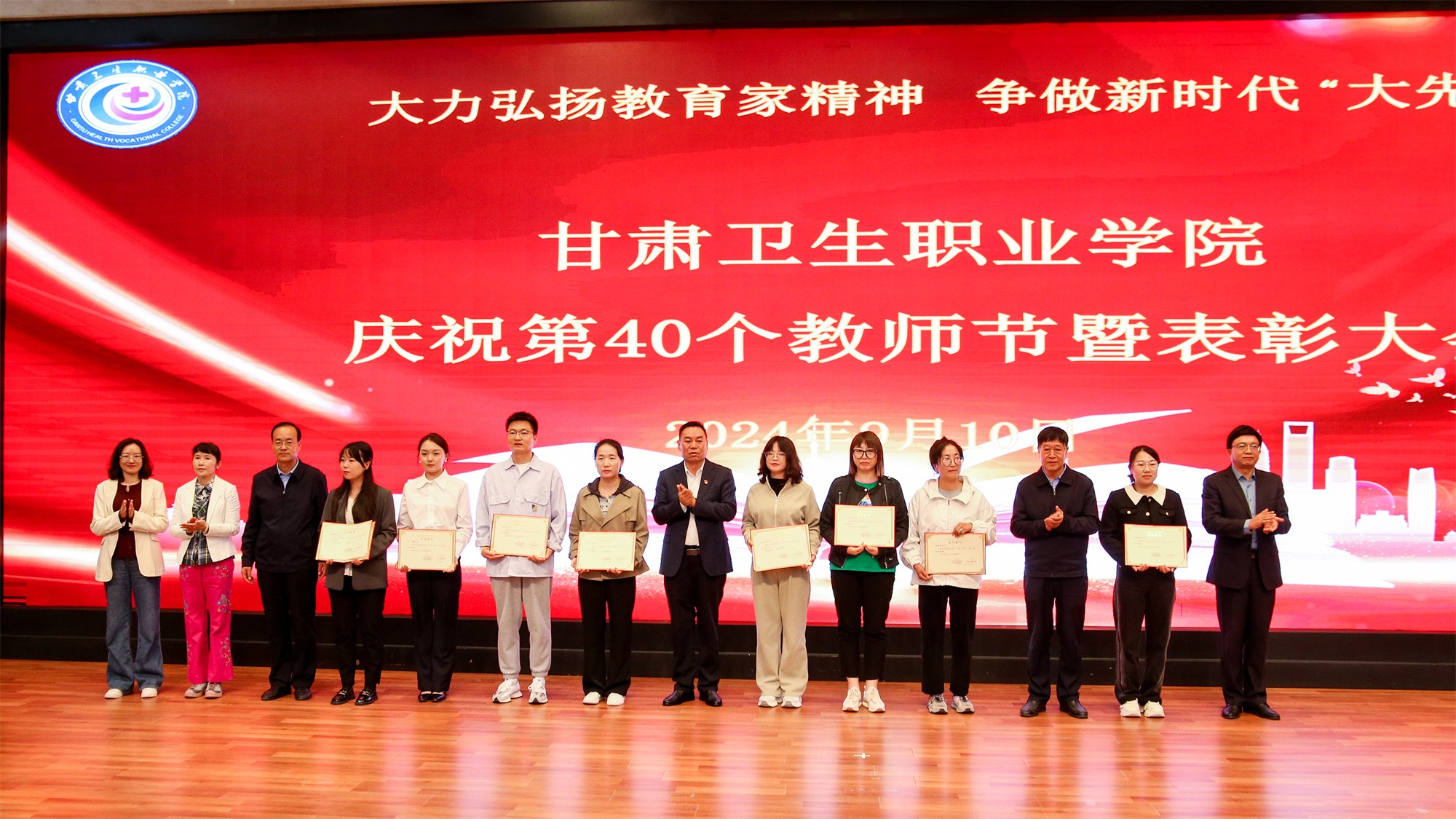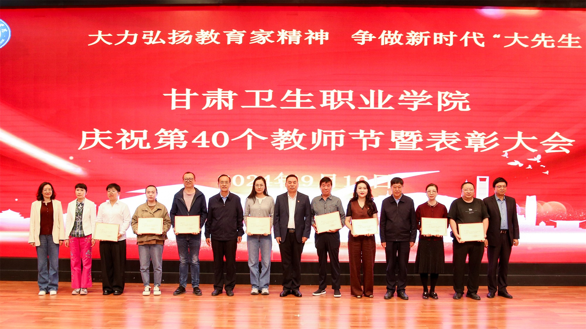 最后,党委书记包磊代表学校党委向默默耕耘、无私奉献的广大教职员工致以节日的问候和崇高的敬意,向受到表彰的先进集体和个人表示热烈祝贺。他赞扬了新入职教师的激情和决心,肯定了在职教师的奉献和成就,以及退休教师的贡献和精神。包磊指出,卫职院因医而名、因医而荣、因师而兴。学校发展正面临着新形势、新阶段、新目标、新要求,面对新的发展机遇,学校正以“锐意改革、矢志跨越”的责任使命和敢于担当的勇气,坚持把教师作为学校发展第一资源,努力形成广大教师尽展其才、高素质专业化创新型教师队伍不断涌现的良好局面。他提出了几点希望与老师们共勉:一是胸怀红色印记,做永远跟党走的教师;二是涵养高尚师德,铺就最美职业底色;三是大兴笃学之风,锤炼高超娴熟师艺;四是紧扣时代脉搏,不断提高新质素养。最后,他表示学校今后将始终坚守教师为立校之本、兴校之源这一本质,大力弘扬尊师重教风尚,用心用情用力做好教师管理服务和培训培养工作,让广大教师安心从教、热心从教、舒心从教。