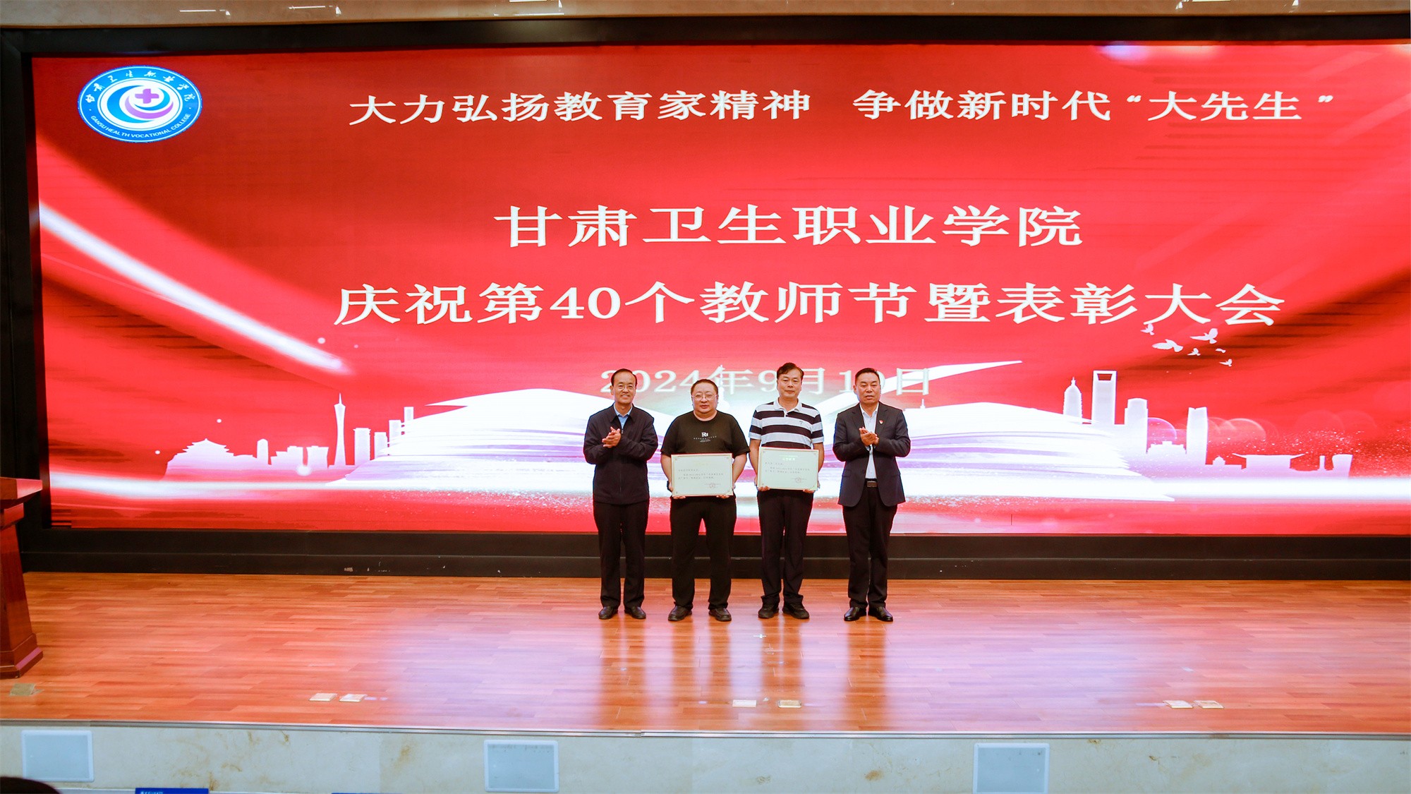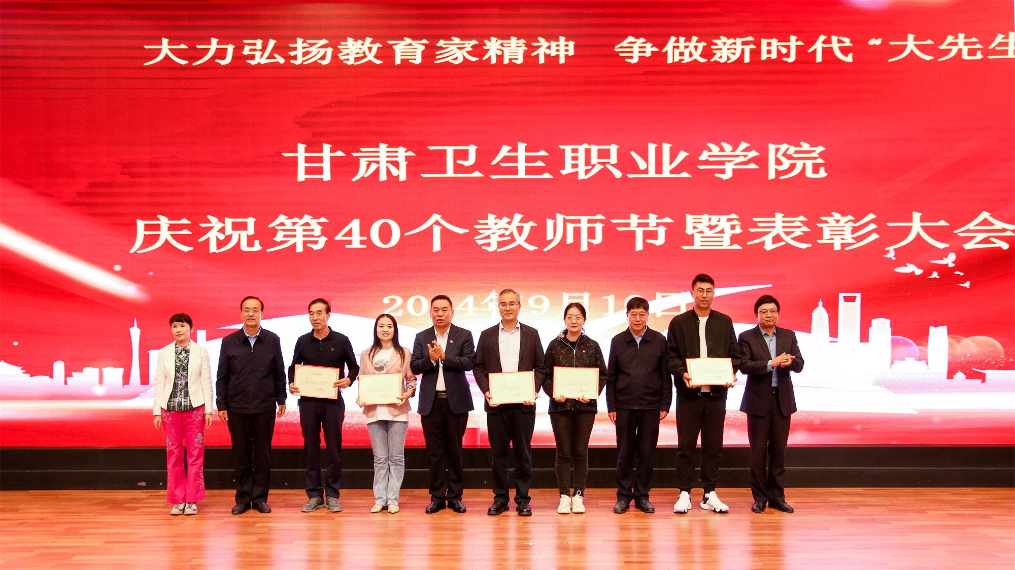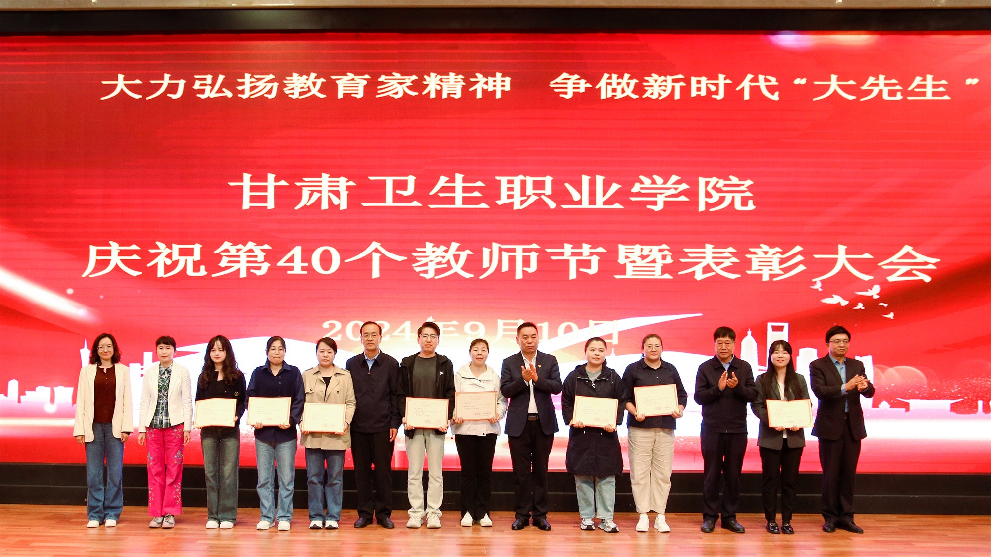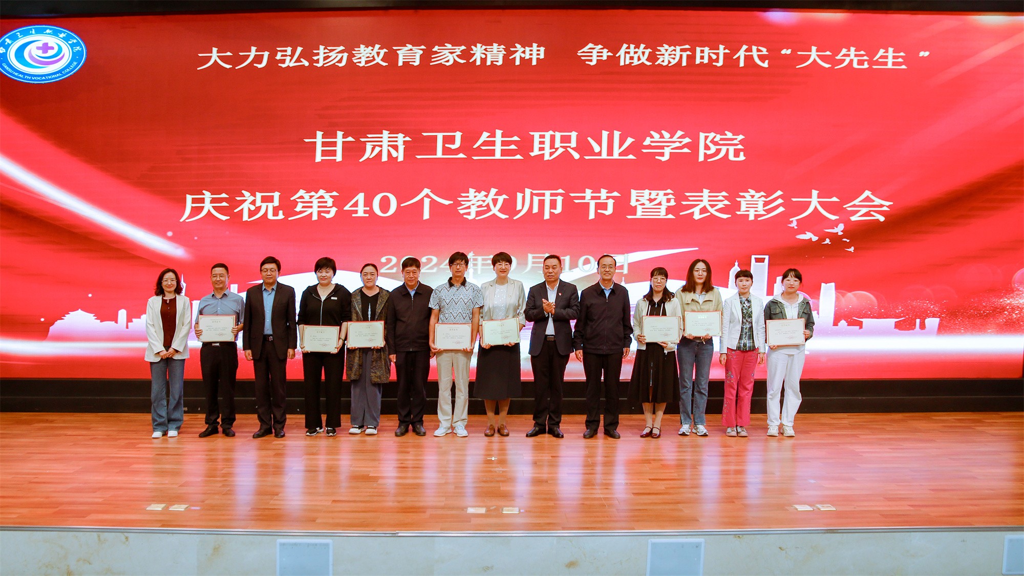 最后,党委书记包磊代表学校党委向默默耕耘、无私奉献的广大教职员工致以节日的问候和崇高的敬意,向受到表彰的先进集体和个人表示热烈祝贺。他赞扬了新入职教师的激情和决心,肯定了在职教师的奉献和成就,以及退休教师的贡献和精神。包磊指出,卫职院因医而名、因医而荣、因师而兴。学校发展正面临着新形势、新阶段、新目标、新要求,面对新的发展机遇,学校正以“锐意改革、矢志跨越”的责任使命和敢于担当的勇气,坚持把教师作为学校发展第一资源,努力形成广大教师尽展其才、高素质专业化创新型教师队伍不断涌现的良好局面。他提出了几点希望与老师们共勉:一是胸怀红色印记,做永远跟党走的教师;二是涵养高尚师德,铺就最美职业底色;三是大兴笃学之风,锤炼高超娴熟师艺;四是紧扣时代脉搏,不断提高新质素养。最后,他表示学校今后将始终坚守教师为立校之本、兴校之源这一本质,大力弘扬尊师重教风尚,用心用情用力做好教师管理服务和培训培养工作,让广大教师安心从教、热心从教、舒心从教。