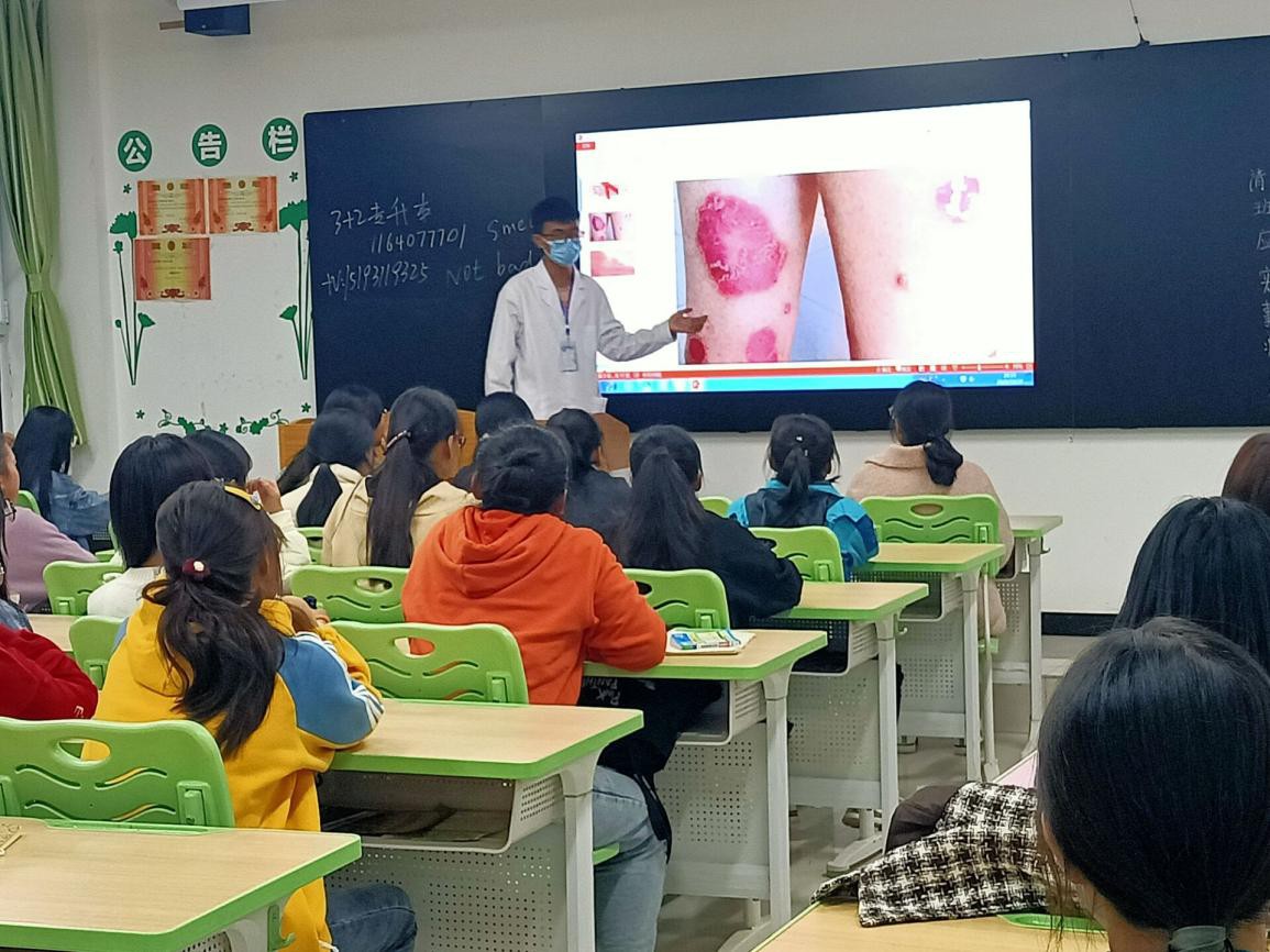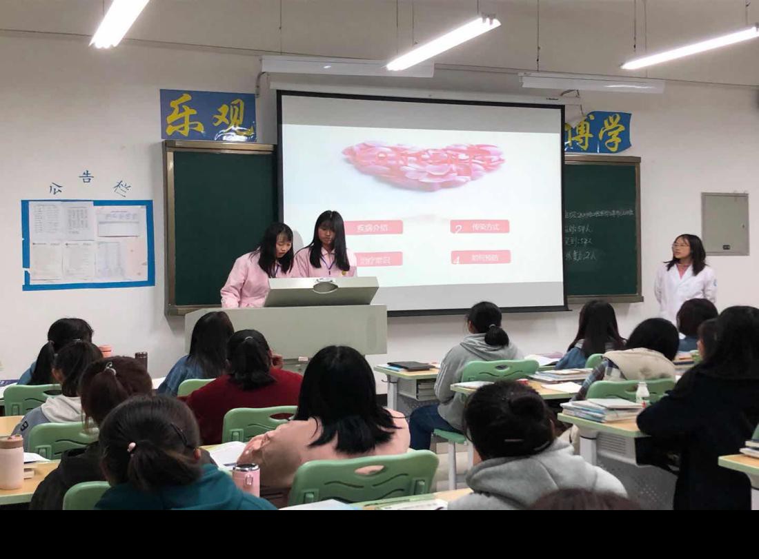 此次班会由附属医院两位主任主持,天使爱心社社员们及附属医院老师对各班进行了艾滋病相关知识宣传及健康教育。主要通过讲解艾滋病相关知识ppt、观看视频等方式,为大家普及什么是艾滋病、艾滋病的目前概况、艾滋病的传播途径和危害,提高同学们预防艾滋病的意识和自我防护能力。