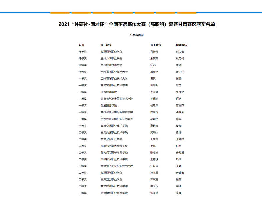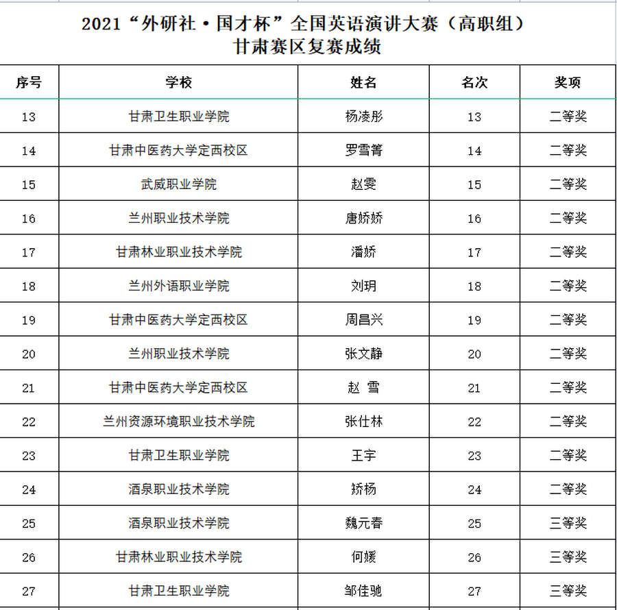 11月7日,2021年“FLTRP·ETIC Cup”English Public Speaking Contest由甘肃省教育厅、甘肃省大学外语教学研究会、外语教学与研究出版社主办,兰州外语职业学院承办,大赛以“Red Star Over China”《红星照耀中国》主题演讲,以激励青年学子学史力行、砥砺奋斗,用外语讲好中国故事、传播中国好声音。天游官网2020级临床三年制15班杨凌彤(指导教师保静)、2018级护理五年制18班王宇(指导教师王丽娟)、2020级康复治疗技术三年制4班邹佳驰(指导教师高小静)代表学校参加甘肃赛区(高职组)线上复赛,经过激烈角逐分别获得两个二等奖、一个三等奖。