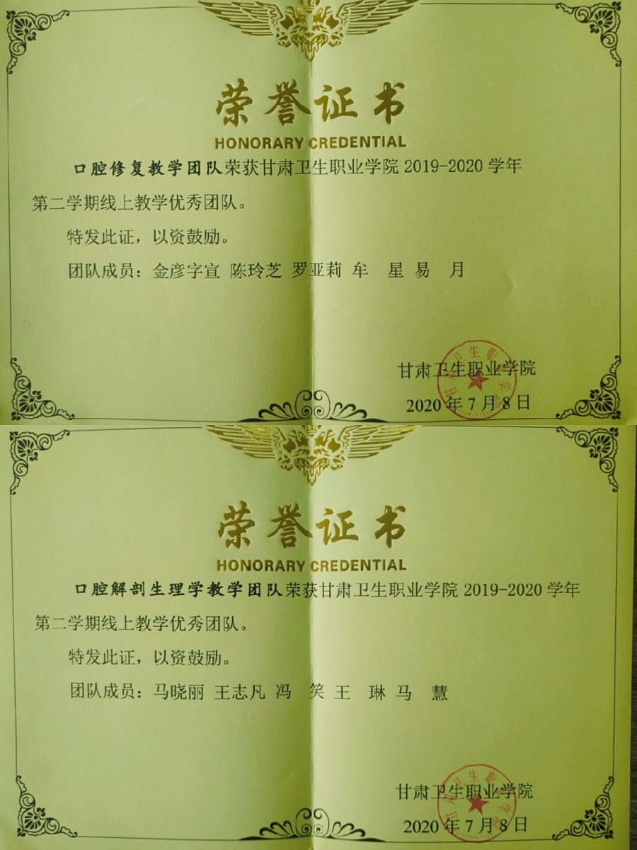 为落实学校《关于印发〈天游8线路检测中心线上教学评优活动方案〉的通知》,经医学技术学院积极申报、教务处评审、校长办公会审议通过,医学技术学院被评为学校唯一的线上教学“优秀二级学院”,学院《口腔解剖生理学》教学团队、《口腔修复》教学团队被评为线上教学“优秀团队”,陈建国、郭艳玲、罗亚莉、张春雨4名教师被评为线上教学“优秀教师”。