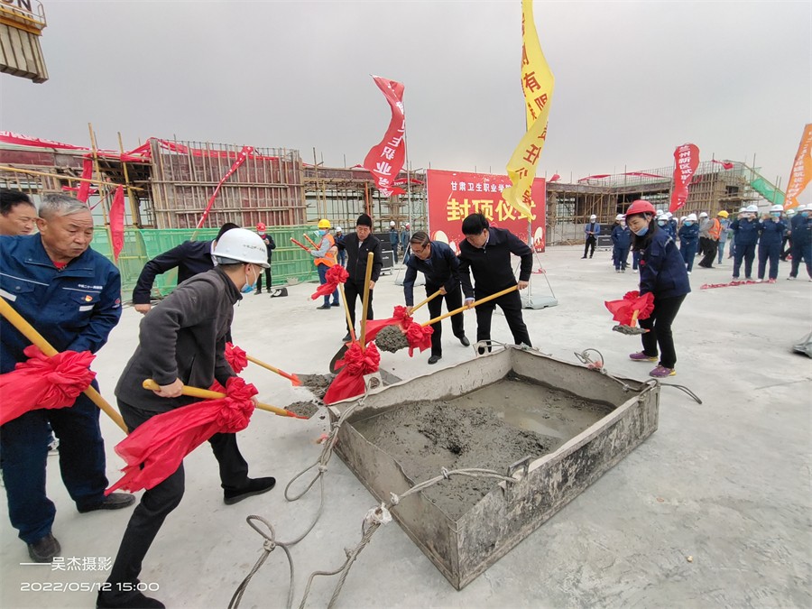 封顶仪式上,党委副书记刘生肸首先代表学校向项目施工单位、监理单位、项目管理单位的领导和工作人员表示热烈的欢迎和衷心的感谢,并向为项目建设付出辛勤劳动的施工人员表示诚挚的慰问。他在致辞中指出,学校教学楼及学生宿舍楼建设项目主体封顶标志着学校教学楼及学生宿舍楼建设项目取得阶段性胜利。同时,在后续的建设过程中,他希望各参建单位要把楼宇的主体封顶当做新的起点,全体参建人员进一步把好质量关,加强安全管理,文明有序施工,按照工程进度,做好楼宇的配套安装和装修工作;继续发扬团结协作、锐意进取的精神,紧抓工程建设的黄金期,着力打造精品工程,争取学校教学楼及学生宿舍楼早日建成投入使用。