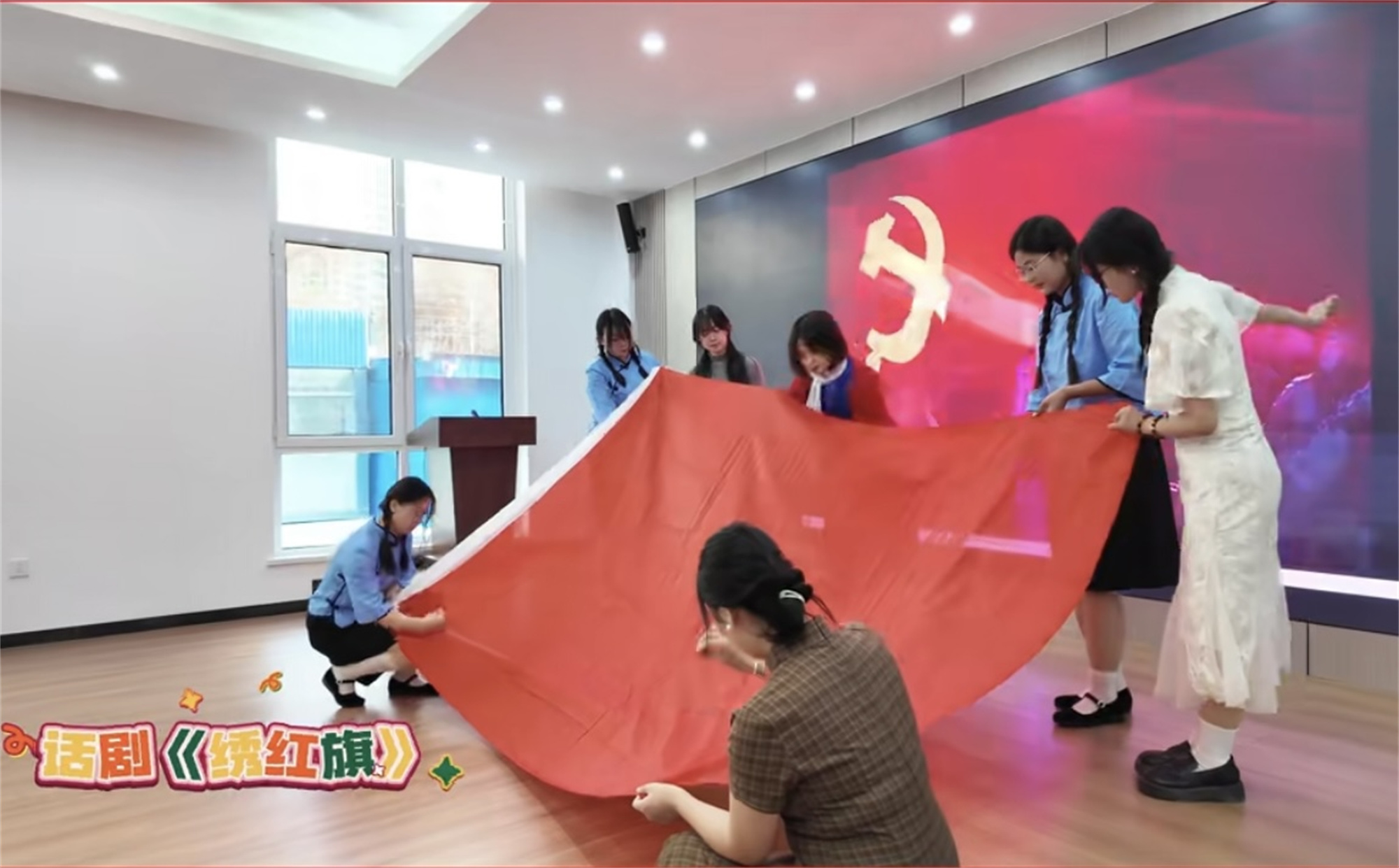 11月12日,甘肃省学习贯彻党的二十届三中全会精神基层巡回宣讲报告会在兰州新区文曲中心社区举行。受社区邀请,天游官网党委宣传部组织学生参加,并选送红色情景剧节目《绣红旗》赴报告会现场演出。