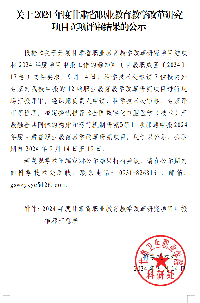 关于2024年度甘肃省职业教育教学改革研究 项目立项评审结果的公示发布时间:2024-09-14