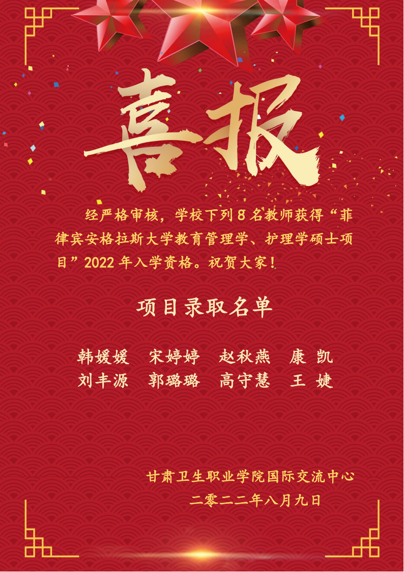学校 8 名教师获得“菲 律宾安格拉斯大学教育管理学、护理学硕士项目”2022 年入学资格发布时间:2022-08-08 -